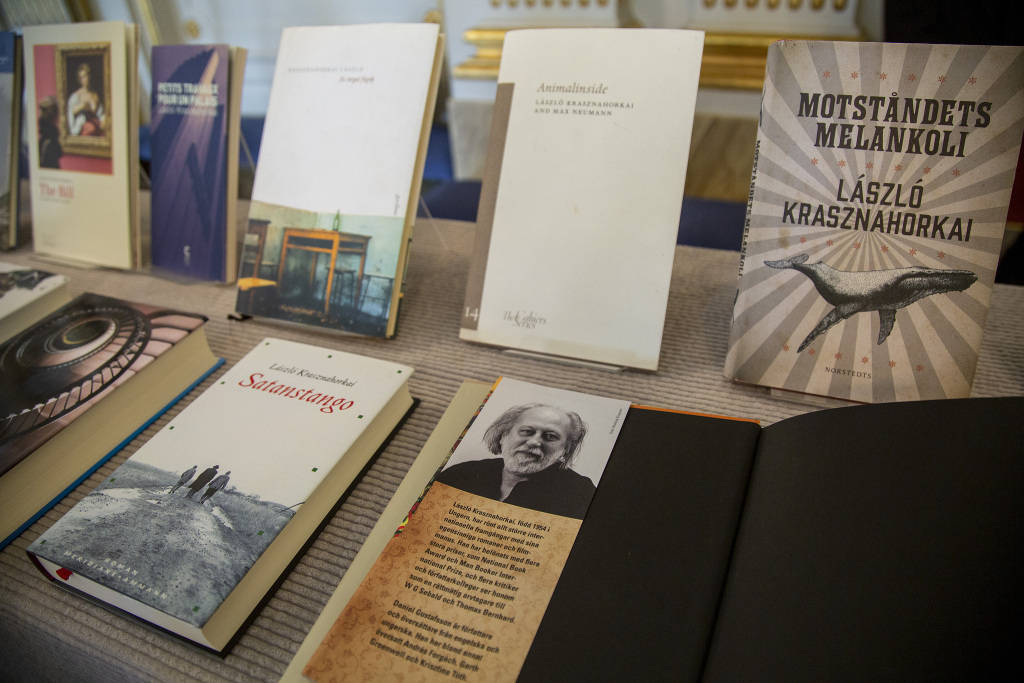 当地时间2025年10月9日,瑞典斯德哥尔摩,匈牙利作家拉斯洛·克拉斯诺霍尔卡伊的著作。