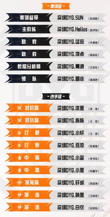 DYG这次转会期也有动作,引进了小轩和晚星,选秀大会选中小名。新赛季首发估计是小轩,流星,小名,钎城和晚星,这个阵容在竞争并不强的1组,应该是可以冲进A组的。