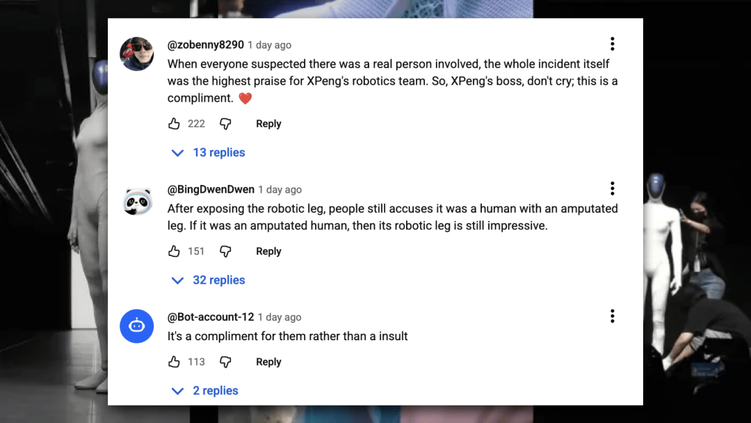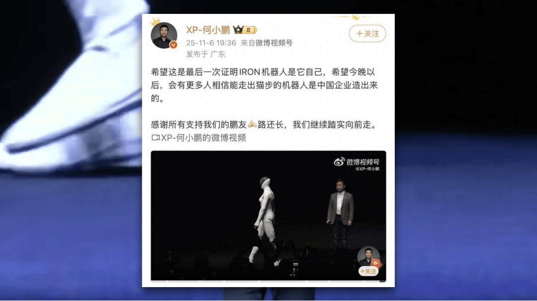 最初,小鹏CEO何小鹏以“感谢大家对仿生技术的认可”的幽默方式回应,但这没用;随后,他发布了一镜到底的视频,拉开机器人背后的拉链展示内部结构,但依然没用;最终,在几天后的另一场发布会上,工作人员当着所有观众的面,用剪刀剪开了正在通电运行的“铁蛋”的左小腿“皮肤”和“肌肉”覆盖件,露出了内部冰冷的金属骨骼、线缆和执行器。